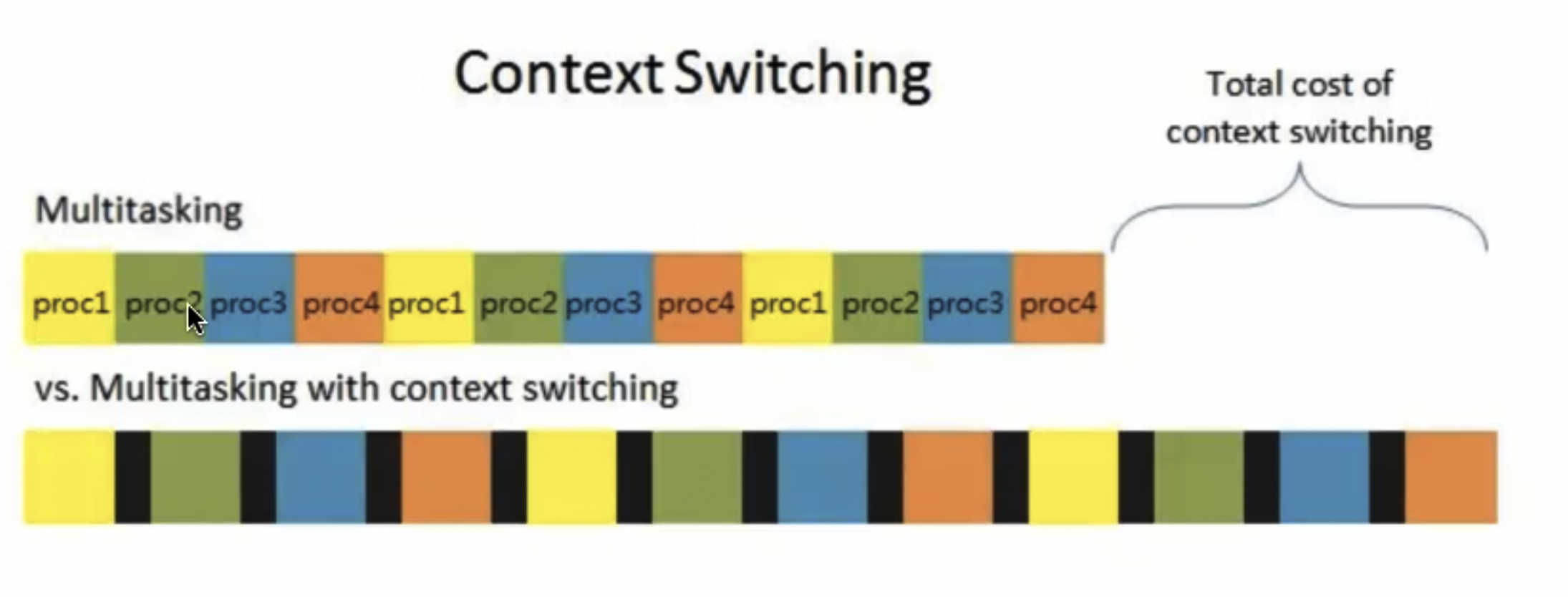 Переключение контекста занимает какое-то время (~1 мкс). Для примера выполнение одной строчки кода занимает ~0.5 нс. Переключение контекста может происходить как у процессов, так и у потоков.