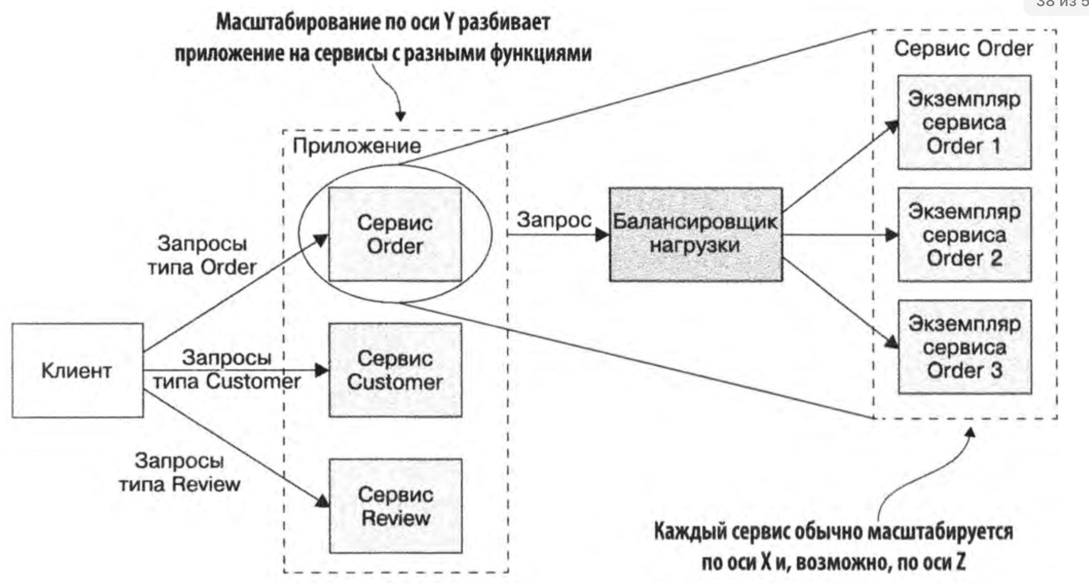 Масштабирование по оси Y основывается на функциональной Декомпозиция на микросервисы. Вместо дублирования или разделения данных приложение разбивается на отдельные модули или сервисы.