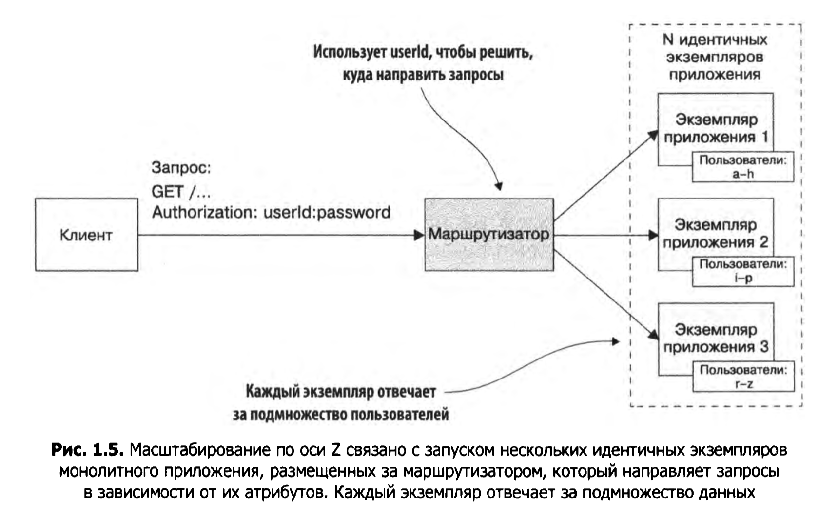 Как это работает: Входящий запрос направляется маршрутизатором к соответствующему экземпляру на основании определенного атрибута (например, userid или региона).