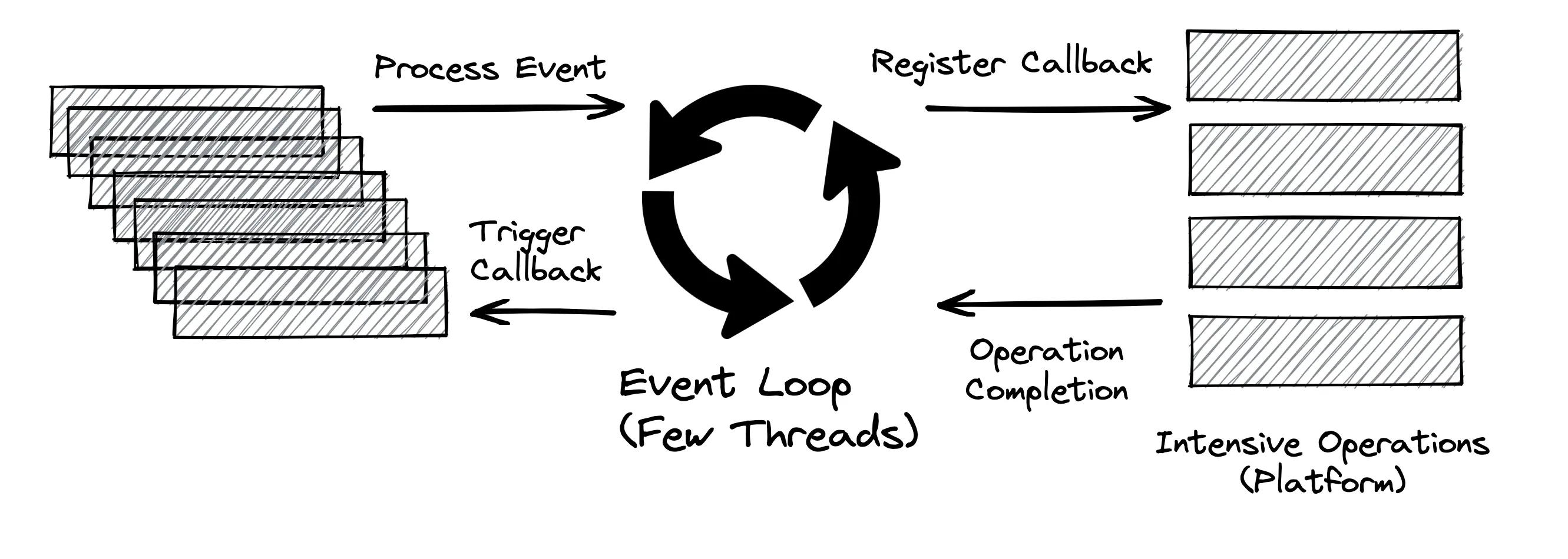 • Цикл событий выполняется непрерывно в одном потоке, хотя у нас может быть столько циклов событий, сколько доступно ../fundamental/Ядро процессора.