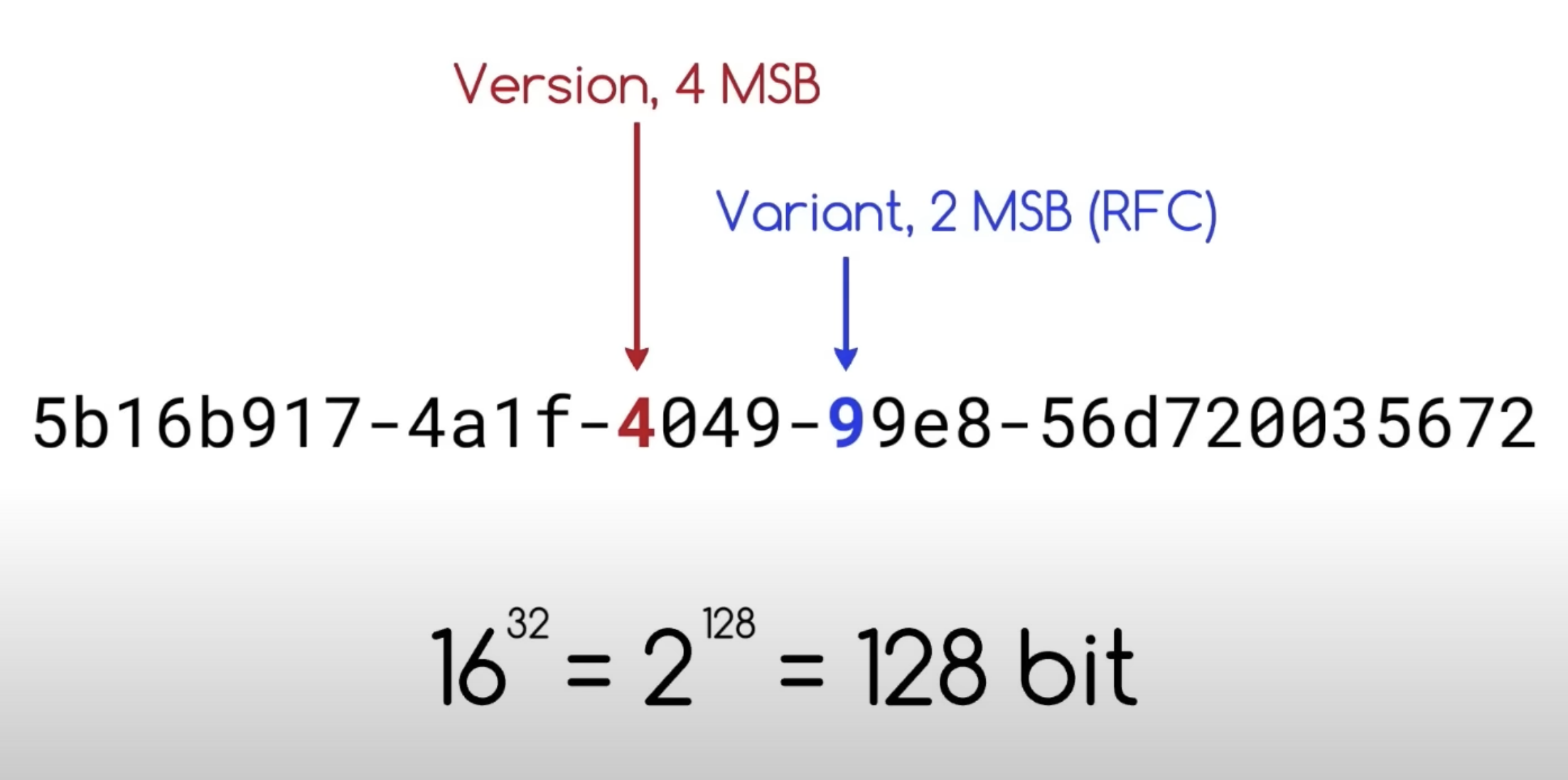 UUID (Universal Unique IDentifier) — это 128-битный идентификатор, представленный в виде строки. Однако для пользовательских данных доступно только 122 бита, так как 6 бит зарезервировано: