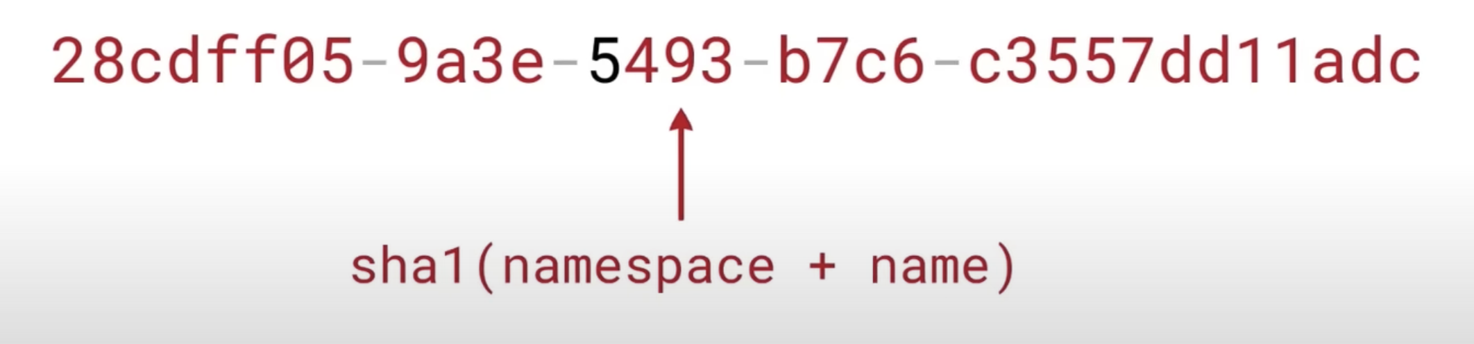 UUID(DNS, "example.com") → 5df41881-3aed-3515-88a7-2f4a814cf09e