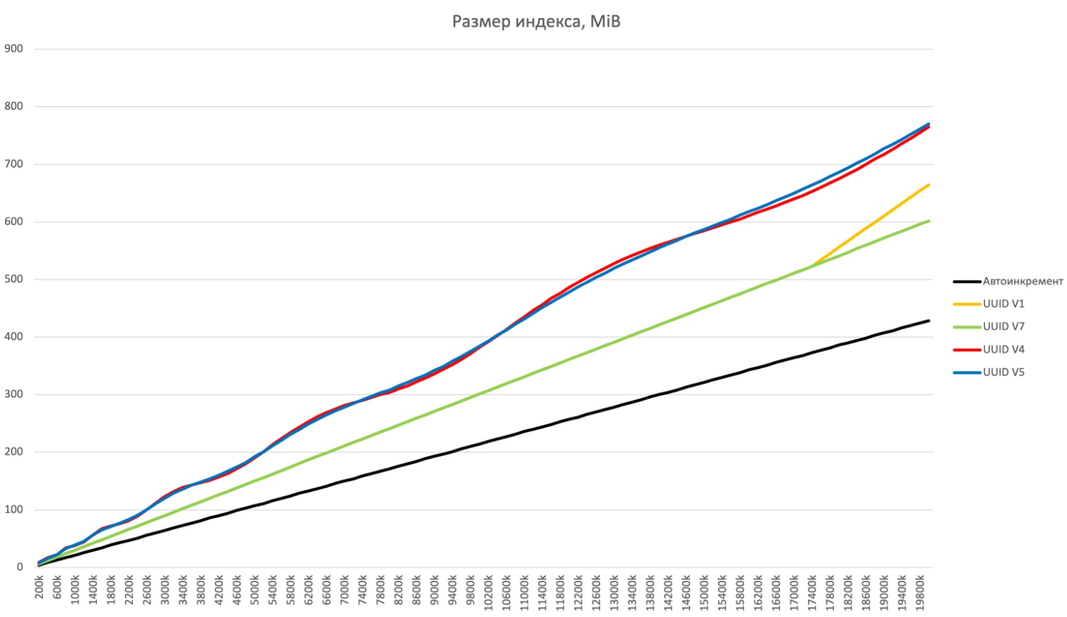 • Константное время вставки: Поскольку UUID V7 монотонно увеличивается со временем и включает случайные данные, вставка в базу данных происходит с постоянным временем.