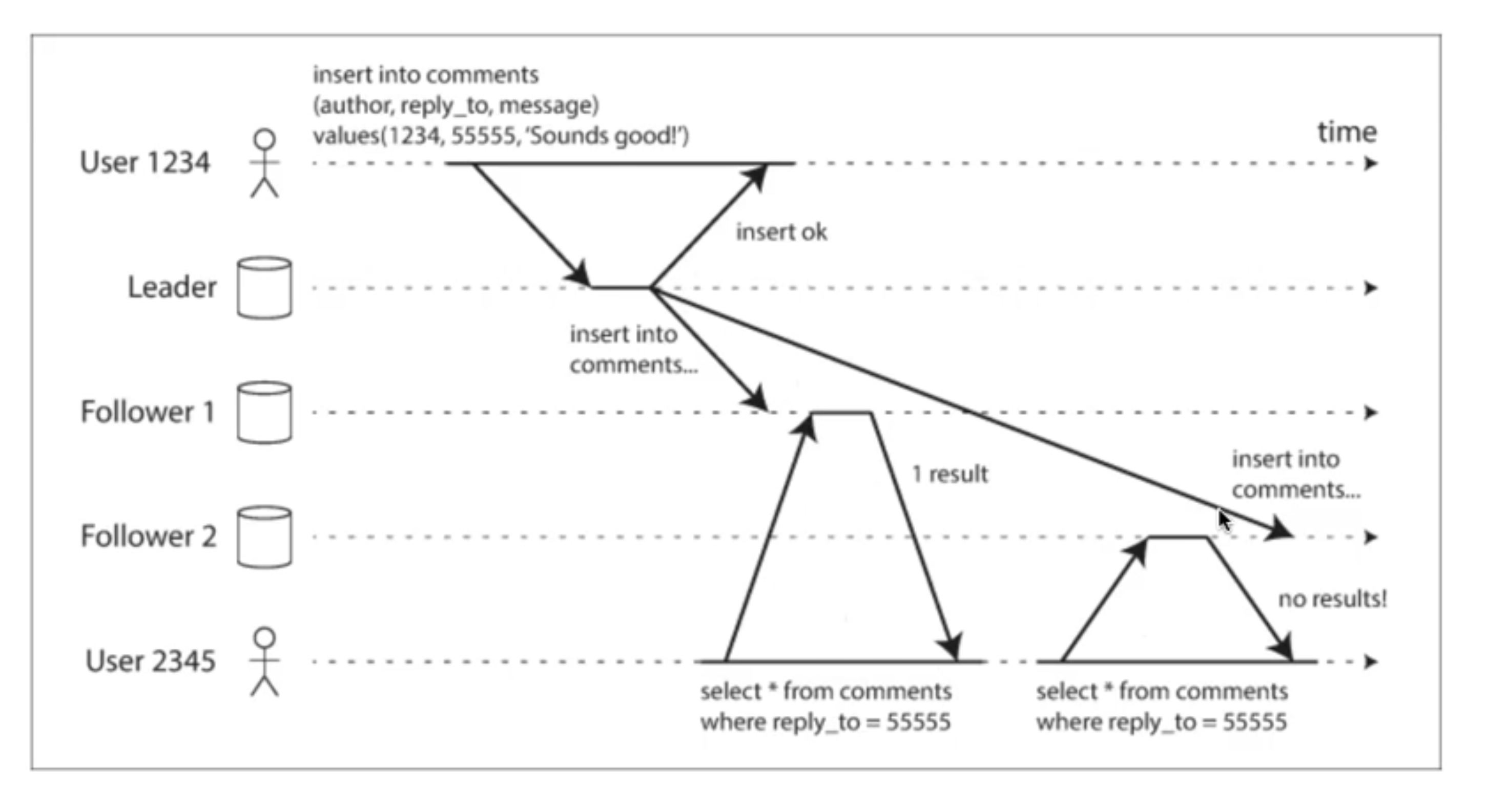 Рассмотрим ситуацию, когда пользователь запрашивает список комментариев к статье. Если новый комментарий был добавлен и записан на мастер, но ещё не успел синхронизироваться со всеми репликами, пользователь может столкнуться с несогласованными результатами: